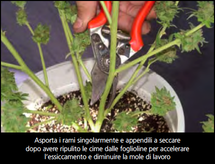 Dopo la raccolta, le cime vengono ripulite con accortezza, tagliando le foglie grandi nel punto in cui sono collegate al gambo. Se si lasciasse il picciolo (il gambo della foglia), ci si potrebbe insediare la muffa. Si sforbiciano via le foglioline più piccole e poco potenti intorno alle cime che presentano poca resina, in modo che rimanga una bellissima cima, dal potente THC. La cimatura risulta agevole quando le foglioline sono morbide e flessibili, subito dopo la raccolta. Tagliare via le foglioline a questo punto inoltre accelera l’essiccamento. Se si aspetta che il fogliame sia secco prima di procedere alla pulizia delle cime, essa risulterà noiosa e lunga. La cimatura più agevole si ottiene con forbici ben affilate e appuntite, per riuscire facilmente a sforbiciare via i piccioli delle foglie attaccati al gambo principale. Quando si concia la cannabis per ore, è indispensabile un paio di forbici ergonomiche. Conviene effettuare la pulizia delle cime sopra un setaccio sottile da serigrafia (cfr. Capitolo 15, “Hashish”) o su un tavolo di vetro. Gratta via le ghiandole di resina cadute sul tavolo o sotto il setaccio. Questa resina potente può essere fumata direttamente, oppure la si può pressare in blocchetti di hashish.